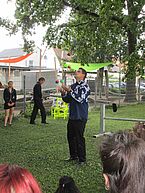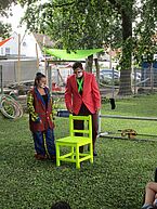 Mr. Sunrise, der Zauberer zeigte für die Kinder und Erwachsenen eine spannende + lustige Zaubershow in der u.a. ein Würfel größer gezaubert wurde. Dann kam plötzlich ein lebendiger Hund, später auch ein und dann 2 Tauben aus einem Kasten. In eine leere Dose zauberte der Zauberer mit Hilfe von einem Kind viele kleine Bonbons, die zum Abschied an die Kinder verteilt wurden.