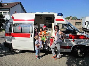 Am Projekt „Paula – Erste Hilfe kinderleicht“ des Deutschen Roten Kreuzes beteiligten sich im Frühjahr 2018 acht Kinder der Kita Lebensbaum. Sie lernten in vier Unterrichtseinheiten, wie man bei kleineren oder auch größeren Unfällen richtig reagiert, Hilfe holt, pflastert, kühlt und verbindet. Die Puppe Paula begleitete sie dabei und stellte sich als Übungsobjekt zur Verfügung. Abschließend kam Frau Messerschmidt, die Projektleiterin, mit dem Krankenwagen an der Kita vorgefahren. Die Kinder besichtigten das Fahrzeug, hatten viele Fragen, die beantwortet werden konnten und ließen sich über den Inhalt des Notfall-Koffers aufklären. Nachdem Paula dann auf dem Beifahrersitz angeschnallt worden war, konnte Frau Messerschmidt wieder nach Germersheim fahren, nicht jedoch, ohne vorher für die winkenden Kinder noch das Blaulicht eingeschaltet zu haben.